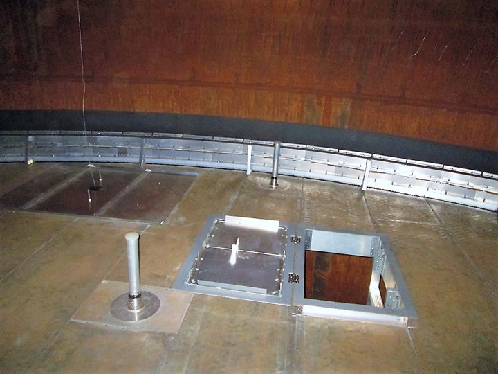 全接液焊接箱式浮頂與液面接觸部分均勻布滿浮箱,因而浮力均勻,運(yùn)行平穩(wěn),保證了浮頂?shù)倪\(yùn)行安全,不會(huì)出現(xiàn)卡盤現(xiàn)象。